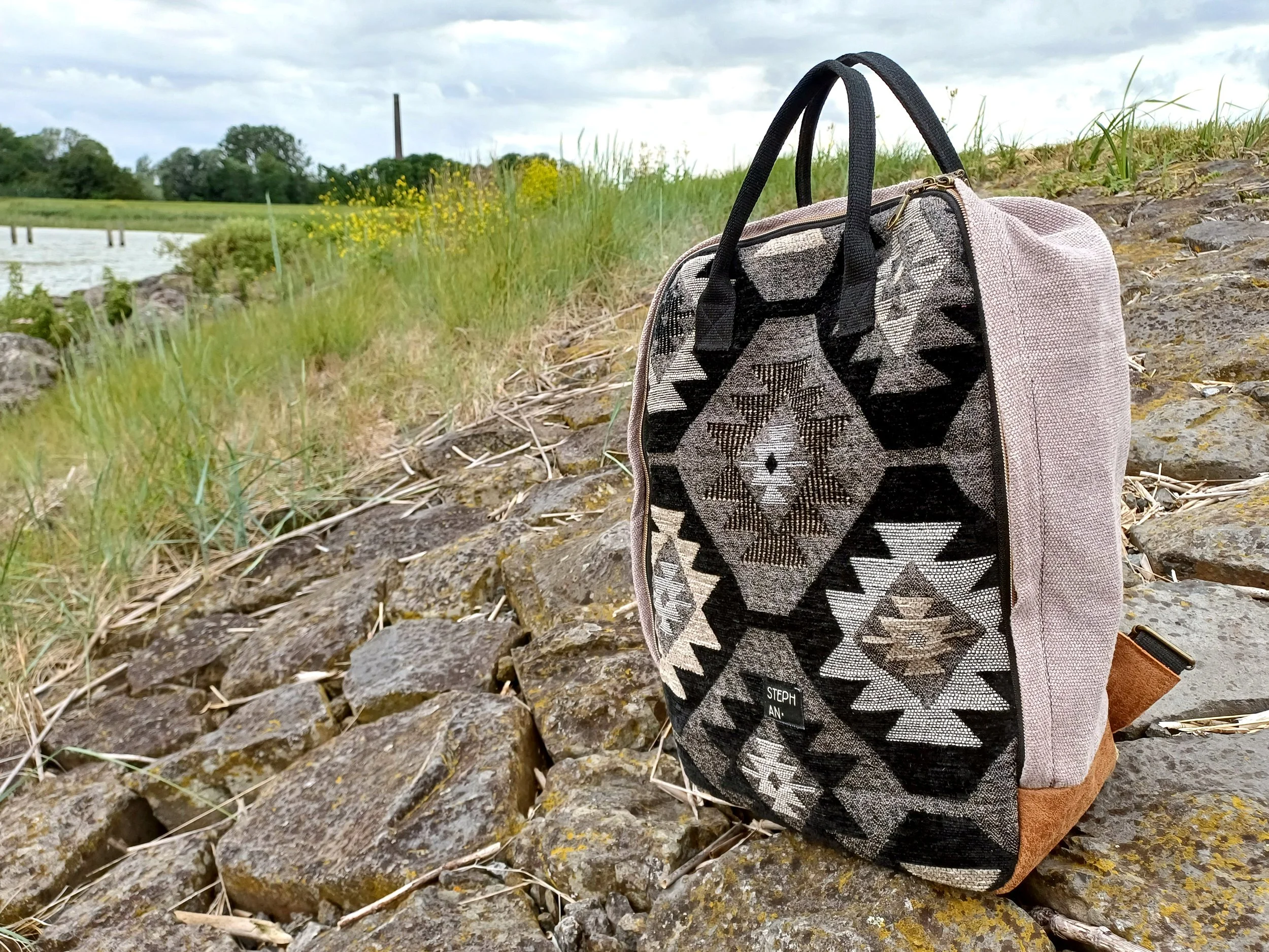 Every material is hand-selected — vintage designer remnants, forgotten florals, repurposed hides, bold patterns from another time. Found offline, chosen by feel.